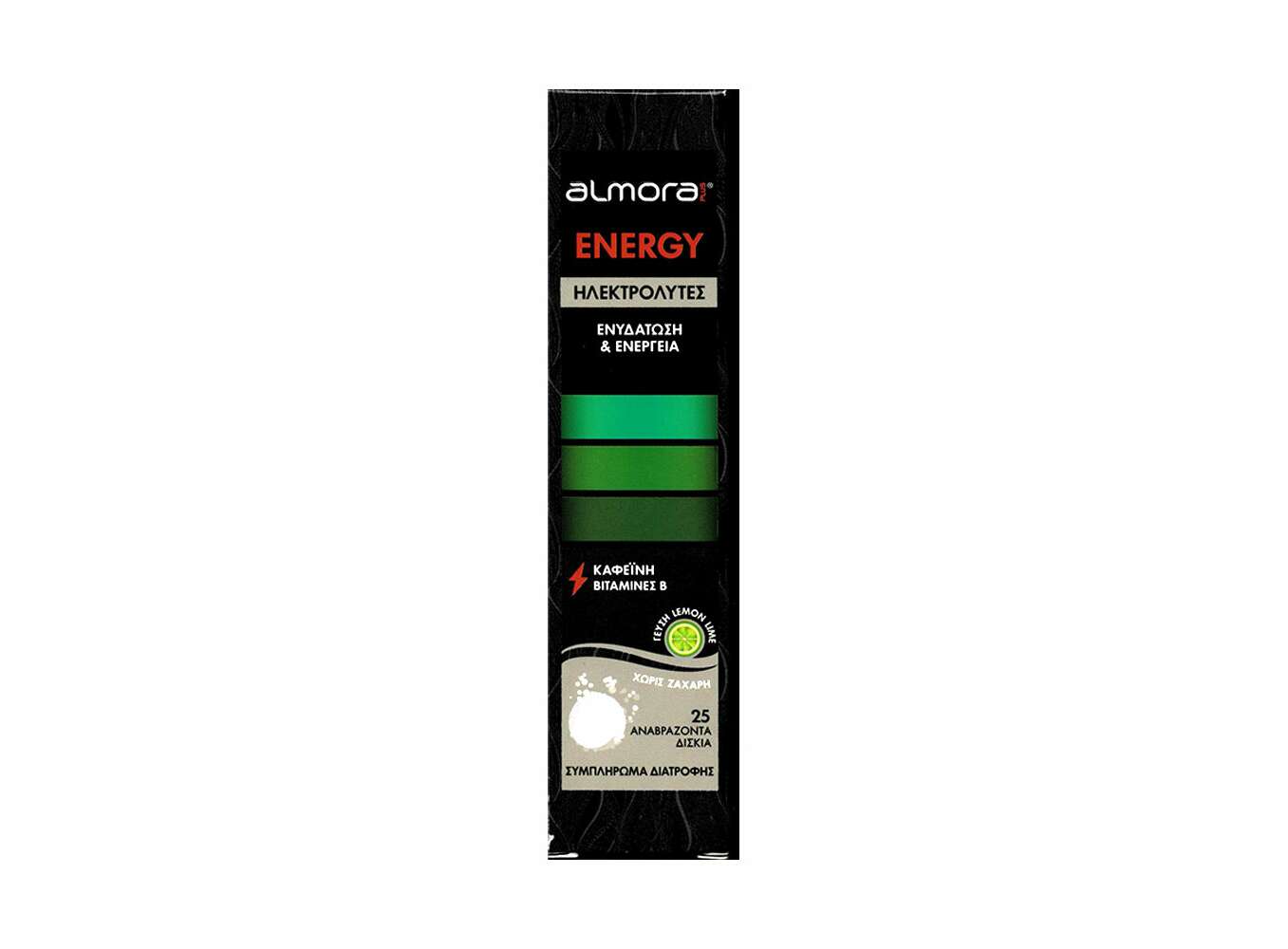 To Almora Energy είναι συμπλήρωμα διατροφής σε αναβράζουσα μορφή με συνδυασμό Ηλεκτρολυτών (Na, Cl, K), Βιταμινών του συμπλέγματος B (Β6, Β9, Β12), καφεΐνης και Βιταμίνης C.