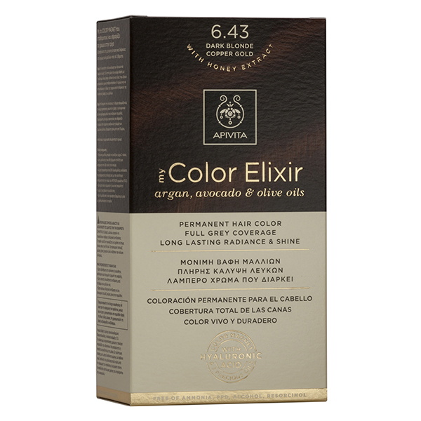 Permanent Hair Color Cream 6.43 INCI UE-(USA): aqua (water), laureth-3, cetearyl alcohol, laureth-4, polysorbate 80, ethanolamiPerne, toluene-2,5-diamine sulfate, glycol distearate, sorbitan stearate, sodium C14-16 olefin sulfonate, cocamidopropyl betaine, glycerin, glyceryl stearate se, cocos nucifera oil (cocos nucifera (coconut) oil), glyceryl isostearate, aminomethyl propanol, oleic acid, stearic acid, sorbitan oleate, 4-chlororesorcinol, peg-40 hydrogenated castor oil, polyquaternium-22, hydrogenated castor oil, ceteareth-20, taurine, palmitic acid, xylitol, sodium sulfite, sodium hydrosulfite, cera alba (beeswax), lecithin, tetrasodium edta, ceteareth-33, erythorbic acid, linum usitatissimum extract (linum usitatissimum (linseed) seed extract), argania spinosa kernel oil*, etidronic acid, olea europaea fruit oil (olea europaea (olive) fruit oil)*, persea gratissima oil (persea gratissima (avocado) oil)*, helianthus annuus seed oil (helianthus annuus (sunflower) seed oil)*, mel extract (honey extract)*, rosmarinus officinalis extract (rosmarinus officinalis (rosemary) leaf extract)*, benzyl alcohol, potassium sorbate, sodium benzoate, parfum (fragrance), phenyl methyl pyrazolone, p-methylaminophenol sulfate, m-aminophenol,