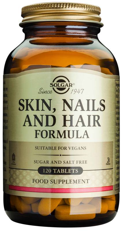 Το Skin, Nails and Hair της SOLGAR® είναι μια εξειδικευμένη διατροφική φόρμουλα πλούσια σε βιταμίνες, αμινοξέα και μέταλλα, ειδικά σχεδιασμένη για να προάγει την καλή υγεία των μαλλιών, του δέρματος και των νυχιών. Ειδικότερα, παρέχει όλα εκείνα τα διατροφικά στοιχεία που είναι απαραίτητα για τη βιοσύνθεση του κολλαγόνου και της κερατίνης, όπως οργανικό θείο (MSM), βιταμίνη C, L-προλίνη, L-λυσίνη, κόκκινο άλγος, κιτρικό ψευδάργυρο και χαλκό. Τα συστατικά αυτά βοηθούν ώστε να παραμένει απαλό το δέρμα, τα νύχια γερά και τα μαλλιά λαμπερά, στοιχεία που αποτελούν δείγμα καλής υγείας. Ο συνδυασμός της επιστημονικής γνώσης της Solgar με τα συστατικά υψηλής ποιότητας που περιέχονται στο συμπλήρωμα διατροφής Skin, Nails and Hair της SOLGAR®: Προάγει την παραγωγή κολλαγόνου και κερατίνης Αφήνει τα μαλλιά λαμπερά και ευκολοχτένιστα Χαρίζει στην επιδερμίδα νεανική και φωτεινή όψη Βοηθά στον σχηματισμό δυνατών και υγιών νυχιών Είναι κατάλληλο για: Άτομα που επιθυμούν να ενδυναμώσουν τα μαλλιά και τα νύχια τους Άτομα που επιθυμούν να βελτιώσουν την όψη της επιδερμίδας τους