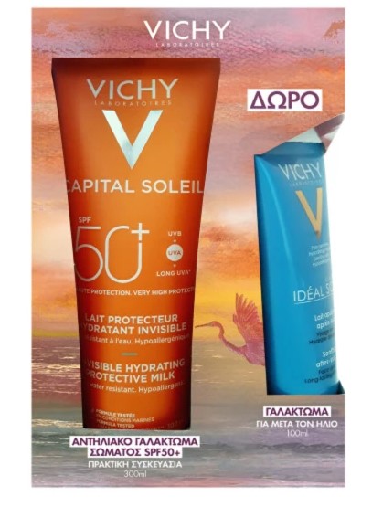 1) Capital Soleil Αντηλιακό Γαλάκτωμα Σώματος Spf50+, 300ml Το Capital Soleil αντηλιακό ενυδατικό γαλάκτωμα προσφέρει υψηλή αντηλιακή προστασία SPF50+, σε μορφή γαλακτώματος. Ενισχυμένο με υαλουρονικό οξύ για ενυδάτωση της επιδερμίδας. Είναι ανθεκτικό στο νερό, μη λιπαρή υφή, που δεν αφήνει λευκά σημάδια. Ιδανικό για: άνδρες γυναίκες παιδιά. 2) After Sun, 100ml Γαλάκτωμα για ενυδάτωση μετά την έκθεση στον ήλιο χωρίς λιπαρή υφή, με διακριτικό άρωμα για ανακούφιση και φρεσκάδα σε κάθε εφαρμογή. Η καθημερινή φροντίδα μετά τον ήλιο για τις ευαίσθητες επιδερμίδες κατάλληλο για άνδρες και γυναίκες. ΑΠΟΤΕΛΕΣΜΑΤΙΚΟΤΗΤΑ Ο συνδυασμός Υαλουρονικού νατρίου, ενός ισχυρού ενεργού ενυδατικού συστατικού, και φυτικού συμπυκνώματος λιπιδίων με μαλακτικές ιδιότητες, συγκρατεί το νερό και ενυδατώνει σε βάθος την αφυδατωμένη από τον ήλιο επιδερμίδα. Γεμάτη θρέψη και βαθιά ανακούφιση, η επιδερμίδα είναι έτοιμη για την επόμενη έκθεση. Από την πρώτη εφαρμογή, η επιδερμίδα καταπραΰνεται και ενυδατώνεται βαθιά. Ημέρα με την ημέρα γίνεται πιο ανθεκτική ενάντια στις επιθέσεις της ηλιακής ακτινοβολίας. ΑΣΦΑΛΕΙΑ Η υποαλλεργική του σύνθεση ΧΩΡΙΣ PARABEN είναι δερματολογικά ελεγμένη σε ευαίσθητες επιδερμίδες. Περιέχει καταπραϋντικό και τονωτικό Ιαματικό Νερό της Vichy.