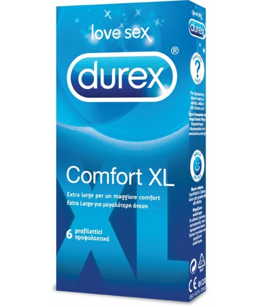 Durex Comfort XL Προφυλακτικά extra large, για περισσότερη άνεση. Προφυλακτικά μεγάλου μεγέθους Extra large και με σπερματοδόχο κατάληξη για άνεση Διαφανή, με λιπαντική επίστρωση από φυσικό ελαστικό latex Ονομαστικό πλάτος : 56mm Συσκευασία: 6 τεμαχίων