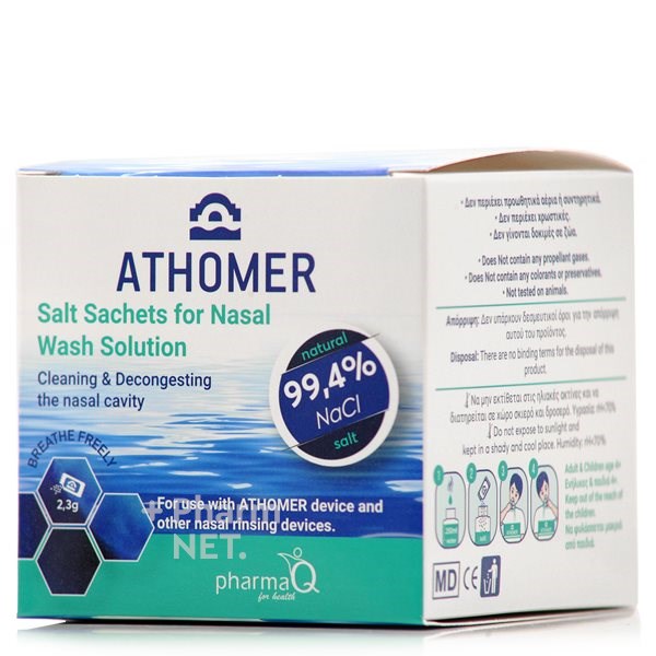 Διαλύετε ένα ή δύο φακελάκια Athomer σε 250ml νερό μέσα στη συσκευή. Σωστή εφαρμογή γίνεται με την έκχυση αλατούχου νερού από το ένα ρουθούνι και την εκροή του από το άλλο.