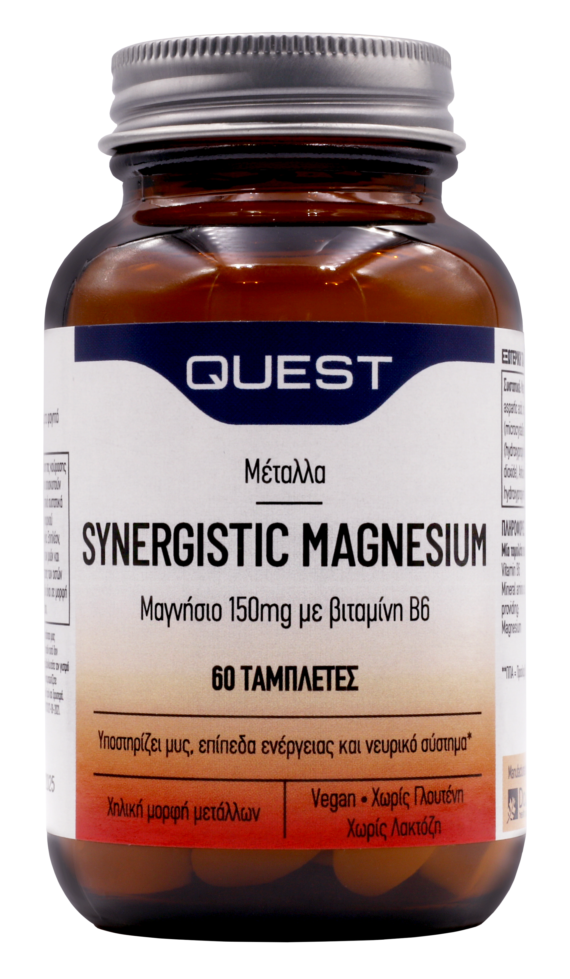 Το συμπλήρωμα διατροφής Synergistic Magnesium 150mg της Quest παρέχει στον οργανισμό μαγνήσιο και βιταμίνη Β6, που αυξάνει την απορρόφησή του.