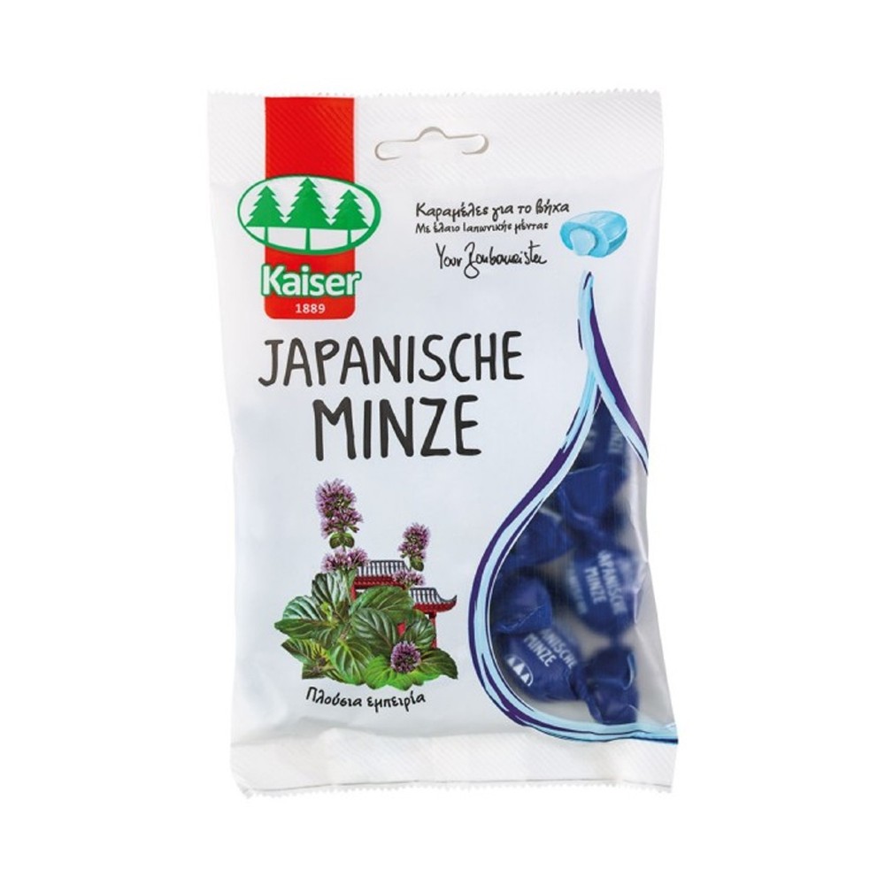 Οι Kaiser Japanische Minze συνδυάζουν τη δυνατή γεύση του ελαίου μέντας και της μενθόλης σε μία καραμέλα με βελούδινη γέμιση που λιώνει αργά στο στόμα και θυμίζει πολική αύρα, ανακουφίζοντας από τον βήχα κι τον πονόλαιμο.