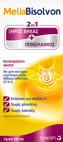 Το MeliaBisolvon, είναι ένα σιρόπι για ξηρό βήχα βασισμένο σε συστατικά φυσικής προέλευσης. Ταυτόχρονα όμως καταπραΰνει τον πονόλαιμο, αφού περιορίζει τη φλεγμονή στο βλεννογόνο του στόματος, του φάρυγγα και του λάρυγγα και προστατεύει το βλεννογόνο σχηματίζοντας μια προστατευτική μεμβράνη, επειδή περιέχει μέλι. Η μεμβράνη αυτή που σχηματίζεται πάνω στα ερεθισμένα σημείο στο λαιμό βοηθά στην αναστολή της πυροδότησης του ξηρού βήχα που οφείλεται σε κνησμώδη λαιμό, περιορίζοντας τον ερεθισμό και τη φλεγμονή στο βλεννογόνο του στόματος και του φάρυγγα και καταπραΰνοντας τον ερεθισμένο λαιμό. Εκτός από μέλι περιέχει ξηρό εκχύλισμα ρίζας Althaea officinalis (Αλθαία) Το MeliaBisolvon δεν περιέχει: • Γλουτένη • Λακτόζη • Συντηρητικά • Αλκοόλη • Τεχνητά αρώματα Αυτό το σιρόπι για ξηρό βήχα είναι κατάλληλο για όλη την οικογένεια, ενήλικες και παιδιά άνω των 2 ετών. Οι διαβητικοί θα πρέπει να λάβουν υπόψη τους ότι καταναλώνοντας το είναι σαν να καταναλώνουν την αντίστοιχη ποσότητα από μέλι. Το μέλι, όπως και όλα τα άλλα σάκχαρα, είναι μια συμπυκνωμένη πηγή υδατανθράκων. Το μέλι θεωρείται βέβαια σε αντίθεση με τη ζάχαρη, τροφή με χαμηλό γλυκαιμικό δείκτη. Αν αναλογιστούμε ότι η μέγιστη δόση του MeliaBisolvon για έναν ενήλικα είναι 6 κουταλάκια του γλυκού μοιρασμένα μέσα στην ημέρα, και ότι ούτως ή άλλως κατά την ασθένεια το σάκχαρο απορρυθμίζεται, θα πρέπει να προσέξετε την ρύθμιση του ενώ το λαμβάνετε, χωρίς ωστόσο να είναι απαγορευτικό για τους διαβητικούς.