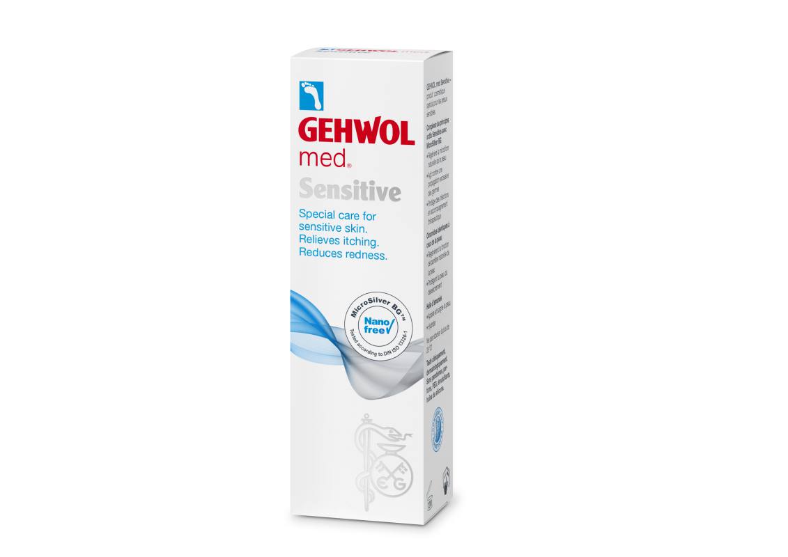 Η κρέμα ειδικής φροντίδας για το ευαίσθητο δέρμα των ποδιών Gehwol med Sensitive ανακουφίζει από τον κνησμό και το αίσθημα καύσου, ενώ παράλληλα ενυδατώνει και καταπραΰνει την επιδερμίδα. Το υψηλής καθαρότητας συστατικό Microsilver BG™ που περιέχει, προστατεύει τη φυσιολογική μικροχλωρίδα της επιδερμίδας, διαταράσσοντας τον κυτταρικό μεταβολισμό των βακτηρίων και των μυκήτων. Το εκχύλισμα τζίντζερ οργανικής καλλιέργειας σε συνδυασμό με τη βισαβολόλη, συμβάλλουν στη μείωση της ερυθρότητας σε μόλις δύο ημέρες ενώ τα κηραμίδια και το θρεπτικό αμυγδαλέλαιο σταθεροποιούν τη λειτουργία φραγμού της επιδερμίδας.