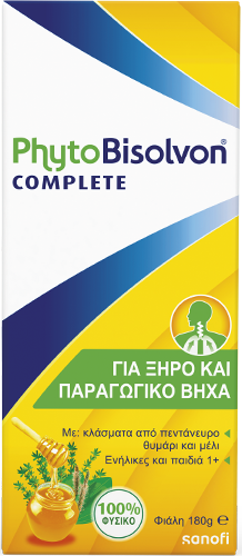 Το PhytoBisolvon Complete είναι ένα σιρόπι για το βήχα με μέλι. Ενδείκνυται για κάθε τύπου βήχα (ξηρό και παραγωγικό βήχα) και ιδίως για τον βήχα που σχετίζεται με λοιμώξεις των ανώτερων αναπνευστικών οδών. Ασκεί διπλή μηχανική δράση στον ερεθισμένο βλεννογόνο: Ευνοεί την ενυδάτωση της βλέννας, διευκολύνοντας τη φυσιολογική της απομάκρυνση. Δημιουργεί μια μεμβράνη που προστατεύει τον βλεννογόνο από την επαφή με εξωτερικούς ερεθιστικούς παράγοντες. Το PhytoBisolvon Complete δρα χάρη στην παρουσία του συμπλέγματος Poliflav M.A. (ένα κλάσμα πολυσακχαριτών από πεντάνευρο) συνδυασμένο με μέλι για τις βλεννοσυγκολλητικές του ιδιότητες και ένα κλάσμα φλαβονοειδών από θυμάρι με αντιοξειδωτική δράση που συμβάλλει στην προστασία του βλεννογόνου. Είναι 100% Φυσικό και δεν περιέχει συντηρητικά, χρωστικές και άλλα συνθετικά έκδοχα. Η φυσική γεύση πορτοκαλιού, ροδάκινου και λεμονιού δίνει στο προϊόν μια ιδιαίτερα ευχάριστη γεύση. Μπορεί να συνδυαστεί με οποιοδήποτε φαρμακευτικό σιρόπι για το βήχα. Οι διαβητικοί θα πρέπει να λάβουν υπόψη τους ότι καταναλώνοντας το είναι σαν να καταναλώνουν την αντίστοιχη ποσότητα από μέλι. Το μέλι, όπως και όλα τα άλλα σάκχαρα, είναι μια συμπυκνωμένη πηγή υδατανθράκων. Το μέλι θεωρείται βέβαια σε αντίθεση με τη ζάχαρη, τροφή με χαμηλό γλυκαιμικό δείκτη. Αν αναλογιστούμε ότι η μέγιστη δόση του Phytobisolvon για έναν ενήλικα είναι 6 κουταλάκια του γλυκού μοιρασμένα μέσα στην ημέρα, και ότι ούτως ή άλλως κατά την ασθένεια το σάκχαρο απορρυθμίζεται, θα πρέπει να προσέξετε την ρύθμιση του ενώ το λαμβάνετε, χωρίς ωστόσο να είναι απαγορευτικό για τους διαβητικούς.