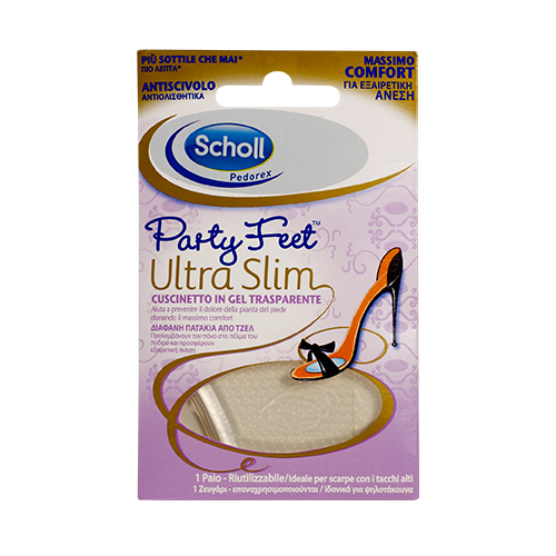 Τα Πατάκια από Τζελ Scholl Party Feet Ultra Slim προσφέρουν αποτελεσματική προστασία από τον πόνο που προκαλείται στο πέλμα του ποδιού (μετατάρσιο) από τη χρήση ψηλοτάκουνων.