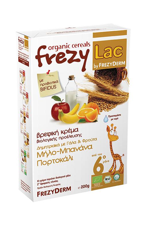 Κρέμα με δημητριακά, μήλο, μπανάνα και πορτοκάλι βιολογικής καλλιέργειας, βιολογικό γάλα και καλλιέργειες Bifidus (Β. breve, Β. bifidum, Β. infantis, Β. longum). Εμπλουτισμένο με όλες τις απαραίτητες βιταμίνες και ιχνοστοιχεία για την υγιή ανάπτυξη του βρέφους.