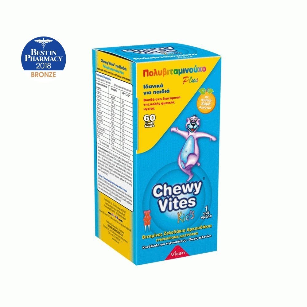 Chewy Vites Πολυβιταμινούχο Plus, μασώμενες πολυβιταμίνες σε μορφή ζελεδάκια αρκουδάκια με υπέροχη φρουτώδη γεύση. Προσφέρουν όλες τις απαραίτητες βιταμίνες και τα μέταλλα που χρειάζονται για τη σωστή ανάπτυξη του παιδικού οργανισμού. Με γεύση βατόμουρο Πολυβιταμινούχο Plus Οι Chewy Vites Πολυβιταμινούχο Plus προσφέρουν όλες τις απαραίτητες βιταμίνες και τα μέταλλα που χρειάζονται για τη σωστή ανάπτυξη του παιδικού οργανισμού με τον πιο διασκεδαστικό τρόπο. Βιταμίνες A, D, E, B6, B12 και C που συμβάλλουν στην ομαλή λειτουργία του ανοσοποιητικού συστήματος. Ιώδιο που συνεισφέρει στη φυσιολογική ανάπτυξη των παιδιών. Βιοτίνη, Παντοθενικό Οξύ, Νιασίνη και τις Βιταμίνες Β12 και Β6 που συμβάλλουν στην ομαλή ενεργειακή απόδοση του μεταβολισμού.