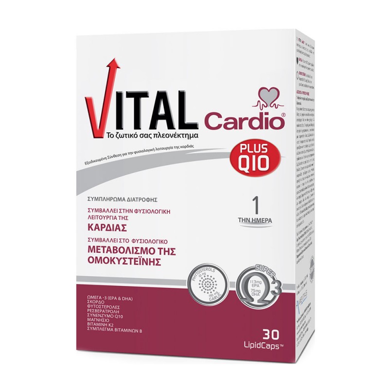 Ωμέγα-3 λιπαρά οξέα (ΕPA & DHA) από ιχθυέλαια υψηλής καθαρότητας, που έχουν καρδιοπροστατευτική και αντιθρομβωτική δράση Φυτοστερόλες, συμβάλλουν στην ρύθμιση και διατήρηση των καλών επιπέδων της χοληστερόλης Σκόρδο, βοηθά στην μείωση της πίεσης , της χοληστερόλης και των τριγκλυκεριδίων. Αποτελεί πανίσχυρο αντιοξειδωτικό. Ρεσβερατρόλη, προσφέρει ισχυρή αντιοξειδωτική προστασία και προστάτευε την καρδιά. Συνένζυμο Q10, υποστηρίζει την υγεία των αρτηριών και την γενική υγεία της καρδιάς. Ισχυρό αντιοξειδωτικό. Βιταμίνη Κ2, προλαμβάνει την αρτηριοσκλήρωση και ωφελεί την υγεία της καρδιάς. Φυλλικό οξύ μειώνει τα επίπεδα ομοκυστεΐνης στο αίμα και συμβάλλει στην διατήρηση την αρτηριακής πίεσης στα φυσιολογικά επίπεδα. Μαγνήσιο, επηρεάζει θετικά τις καρδιακές συστολές και επιτρέπει στην καρδιά να χαλαρώσει. Βιταμίνες Β1, Β2, Β6 &Β12 υποστηρίζουν την καλή καρδιαγγειακή υγεία. Προτείνεται σε άνδρες και γυναίκες: – Που επιθυμούν να διατηρήσουν και να βελτιώσουν τα φυσιολογικά επίπεδα χοληστερόλης στο αίμα Που επιθυμούν να διατηρήσουν την αρτηριακή πίεση και καρδιακή τους υγεία σε φυσιολογικά επίπεδα Ακολουθούν εξειδικευμένο διαιτολόγιο, για να επαναφέρουν σε φυσιολογικά επίπεδα την πίεση του αίματος ή και την χοληστερίνη και τριγλυκερίδια Που λαμβάνουν στατίνες, (μείωση της παραγωγής Q10 ή άτομα μεγάλης ηλικίας, που η ενδογενής παραγωγή του συνένζυμου Q10 από τον οργανισμό μειώνεται) Με υψηλά επίπεδα ομοκυστεΐνης στο αίμα Που χρειάζεται να εξισορροπήσουν τα επίπεδα της «καλής» (HDL )και της «κακής» (LDL) χοληστερίνης – Χωρίς υδράργυρο, μόλυβδο, αρσενικό, κάδμιο, PCB’s και διοξίνες. – Δεν περιέχει ζάχαρη & συντηρητικά. Καινοτόμος φαρμακοτεχνική μορφή κάψουλας που παρέχει τα ακόλουθα πλεονεκτήματα: – Ταχεία δράση Λιγότερη γαστρική επιθετικότητα Συγκάλυψη των δυσάρεστων γεύσεων και οσμών
