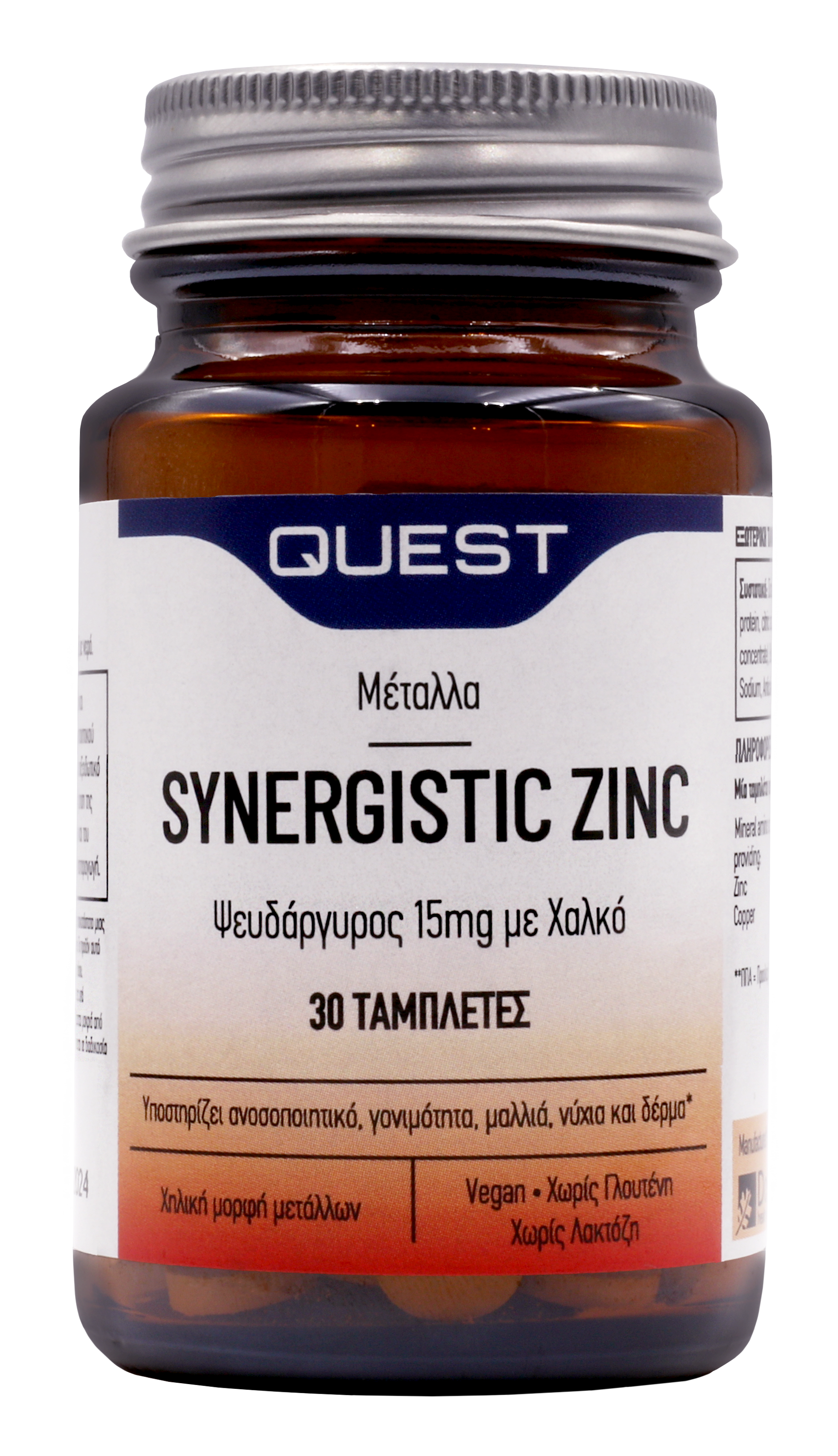 Το Synergistic Zinc 15mg της Quest είναι συμπλήρωμα διατροφής και δεν υποκαθιστά μια ισορροπημένη διατροφή. Αρ. Γνωστ. ΕΟΦ: 29080/01-07-2000.