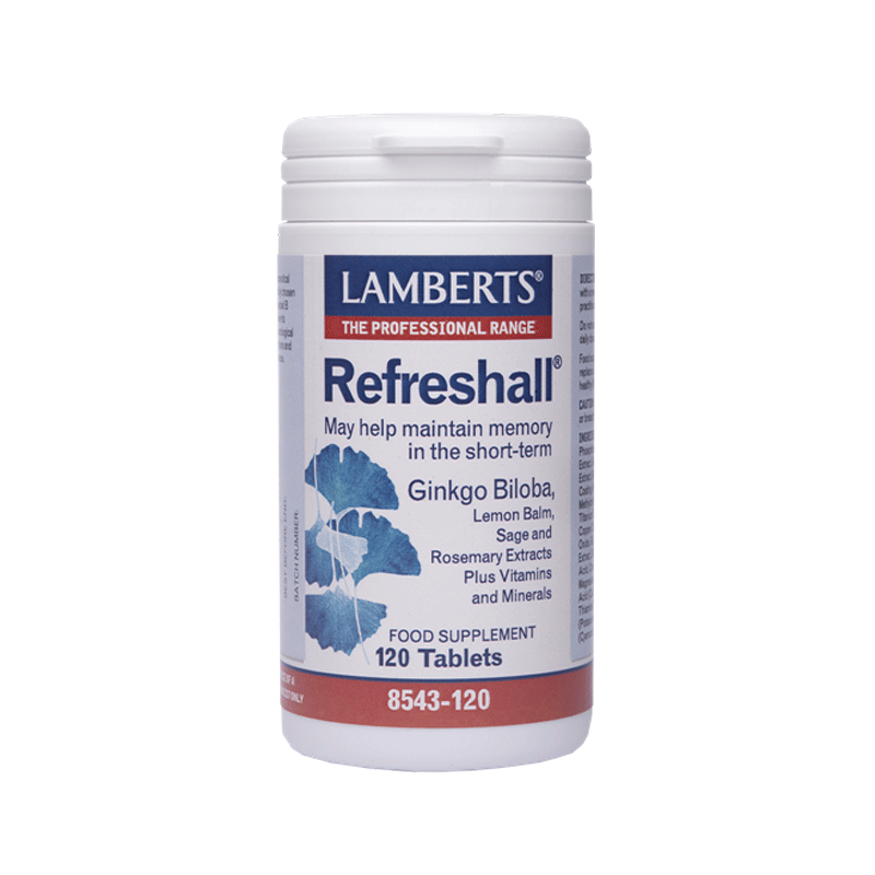 Το Refreshall της Lamberts αποτελεί ένα προϊόν υψηλής ισχύος Gingko Biliba στην συνιστώμενη δοσολογία των 2 ταμπλετών ημερησίως. Σχεδόν όλες οι κλινικές μελέτες στις οποίες χρησιμοποιήθηκε Ginkgo biloba έχουν διεξαχθεί με ένα τιτλοδοτημένο εκχύλισμα που ονομάζεται GBE, που περιέχει 24% γλυκοσίδες. Αυτό το τιτλοδοτημένο εκχύλισμα χρησιμοποιείται σε όλα τα σκευάσματα της Lamberts που περιέχουν Gingko, συμπεριλαμβανομένου του Refreshall. Εκτός του Gingko Biloba, το Refreshall παρέχει τιτλοδοτημένα εκχυλίσματα από Lemon Balm (Μελισσόχορτο- Melissa officinalis), Sage (Φασκόμηλο) και Rosemary (Δενδρολίβανο) καθώς και: • θειαμίνη και Βιταμίνη B12 τα οποία συμβάλλουν* στη φυσιολογική λειτουργία του νευρικού συστήματος , • Παντοθενικό οξύ το οποίο συμβάλλει* στη φυσιολογική νοητική επίδοση και • Ιώδιο το οποίο συμβάλλει* στη φυσιολογική γνωσιακή λειτουργία και στη φυσιολογική λειτουργία του νευρικού συστήματος Όπως όλα τα σκευάσματα της Lamberts παρασκευάζεται εντός του Ηνωμένου Βασιλείου σύμφωνα με τα αυστηρά πρότυπα της Φαρμακευτικής GMP (Pharmaceutical GMP).