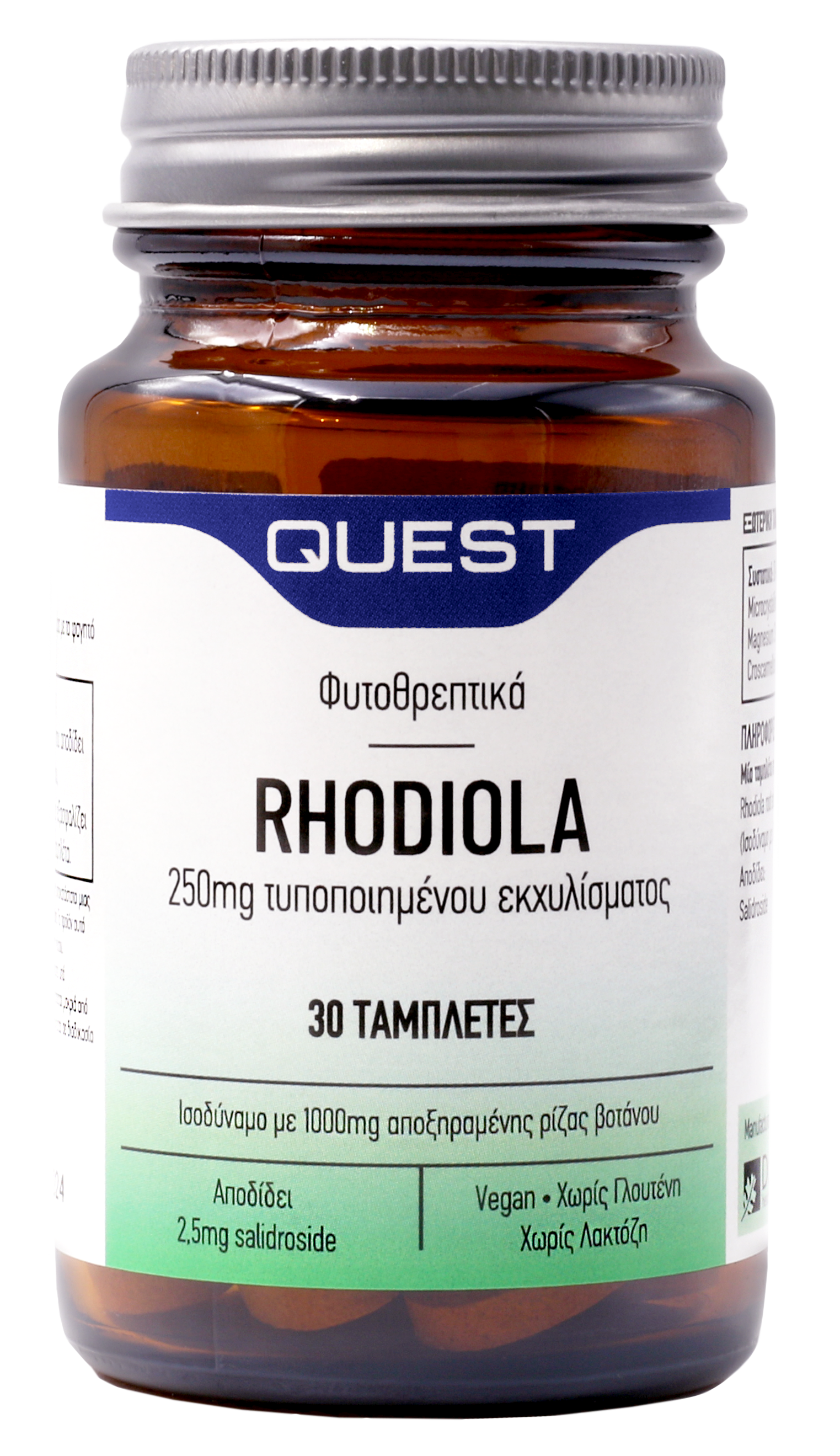Το Rhodiola της Quest περιέχει τυποποιημένο εκχύλισμα ρίζας ροντιόλας, το οποίο ισοδυναμεί με 1000mg αποξηραμένης ρίζας του βοτάνου και αποδίδει 2,5mg salidroside, που είναι δραστικό συστατικό αυτού του παραδοσιακά χρησιμοποιούμενου βοτάνου.