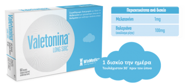 O επαρκής και ποιοτικός ύπνος είναι ζωτικής σημασίας για την καλή υγεία και ευεξία του οργανισμού, κάτι που έχει γίνει αντιληπτό από την αρχαιότητα. Δεν είναι τυχαίο που στην Αρχαία Ελλάδα θεωρούσαν τον ύπνο ως μία μορφή επικοινωνίας με τους θεούς. Δυστυχώς, όμως, ο «καλός ύπνος» είναι για πολλούς ανθρώπους ένα άπιαστο όνειρο. Σύμφωνα με έρευνες ο 1 στους 3 ενήλικες αντιμετωπίζει πρόβλημα ύπνου που σχετίζεται είτε με την ποιότητα είτε με την ποσότητα του ύπνου, το οποίο έχει αρνητική επίδραση στην ψυχική και σωματική υγεία του ατόμου. Κάνε το όνειρο πραγματικότητα με Valetonina® Η Valetonina®, ένα συμπλήρωμα διατροφής με Μελατονίνη και Βαλεριάνα, είναι κατάλληλο για την αντιμετώπιση της αϋπνίας και του jet lag. H Valetonina® έχει σχεδιαστεί με μία καινοτόμο προσέγγιση, η οποία επιτρέπει την απελευθέρωση των 2 συστατικών της – της Μελατονίνης και της Βαλεριάνας – σε διαφορετικούς χρόνους, εξασφαλίζοντας έτσι διπλή και παρατεταμένη δράση. Η επικάλυψη του δισκίου, η οποία περιέχει τη Μελατονίνη, διαλύεται γρήγορα συμβάλλοντας στη μείωση του χρόνου επέλευσης του ύπνου. Στο εσωτερικό του δισκίου, δηλ. στον πυρήνα, βρίσκεται η βαλεριάνα (εκχύλισμα ρίζας), η οποία απελευθερώνεται σε δεύτερο χρόνο προσφέροντας έναν παρατεταμένο και ήρεμο ύπνο κατά τη διάρκεια της νύχτας. Η Valetonina® χάρη στην έξυπνη σύνθεσή της και τον καινοτόμο σχεδιασμό της : Μειώνει το χρόνο επέλευσης του ύπνου Προσφέρει έναν παρατεταμένο, ήρεμο και ποιοτικό ύπνο Εξασφαλίζει ένα ευχάριστο ξύπνημα Βελτιώνει την ευεξία, τη διάθεση και την καθημερινή δραστηριότητα Επανασυγχρονίζει το βιολογικό ρολόι του οργανισμού Μελατονίνη Ο ρυθμιστής του εσωτερικού μας ρολογιού Η μελατονίνη είναι μία φυσική ορμόνη που παράγει ο οργανισμός μας και η οποία καθορίζει τον κύκλο ύπνου-εγρήγορσης. Το ρολόι του οργανισμού μας ελέγχει πόση μελατονίνη παράγεται κατά τη διάρκεια του 24ώρου. Η έκκριση της μελατονίνης αυξάνει αργά το απόγευμα, κορυφώνεται στο μέσο της νύχτας ενώ τις πρώτες πρωινές ώρες μειώνεται ώστε να επιτευχθεί η πρωινή αφύπνιση. Το φως, κυρίως το κυανό, παρεμποδίζει την παραγωγή μελατονίνης στον εγκέφαλο. Τα φυσικά επίπεδα της μελατονίνης παρουσιάζουν μία πτώση με την πρόοδο της ηλικίας με αποτέλεσμα την αύξηση της συχνότητας των διαταραχών ύπνου, κυρίως μετά τη μέση ηλικία. Στα άτομα που πάσχουν από αϋπνίες έχει αποδειχθεί ότι μετά από λήψη μελατονίνης για 3 εβδομάδες η ποιότητα του ύπνου βελτιώνεται, οι νυχτερινές αφυπνίσεις μειώνονται και πρωτίστως μειώνεται ο χρόνος ως την επέλευση του ύπνου, δηλ. κοιμούνται πιο γρήγορα. Η μελατονίνη επιτρέπει τη βελτίωση του νυχτερινού ύπνου, ώστε να είμαστε πιο ξεκούραστοι και σε μεγαλύτερη εγρήγορση κατά τη διάρκεια της ημέρας. Βαλεριάνα Το ηρεμιστικό της φύσης. Η βαλεριάνα είναι φυτό γνωστό από την αρχαιότητα για τις ηρεμιστικές και αγχολυτικές του ιδιότητες, οι οποίες την κατατάσσουν ανάμεσα στα καλύτερα ηρεμιστικά της φύσης. Η δράση της οφείλεται σε έλαια που περιέχει, τα οποία έχουν παρόμοια δράση με τις βενζοδιαζεπίνες. Η βαλεριάνα συμβάλλει στη μείωση του ψυχολογικού στρες ευνοώντας τον γαλήνιο ύπνο.