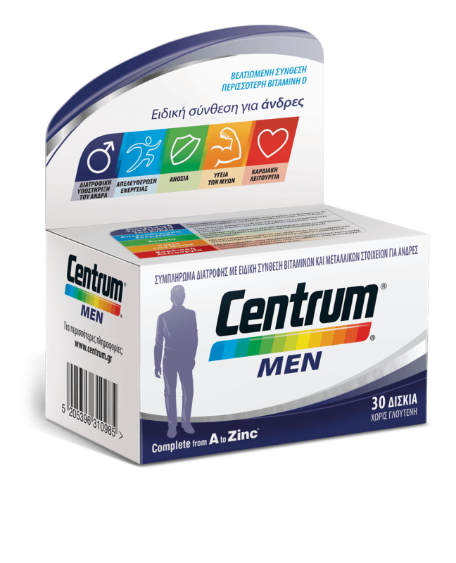 Για αυτόν τον λόγο, το Centrum Men είναι ένα συμπλήρωμα διατροφής που έχει σχεδιασθεί ειδικά για να καλύπτει τις ανάγκες των ανδρών σε μικροθρεπτικά συστατικά (βιταμίνες, μέταλλα και ιχνοστοιχεία).