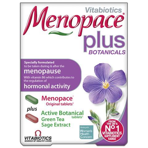 Οι έξτρα ταμπλέτες του Menopace Plus περιέχουν εκχύλισμα σόγιας, φασκόμηλο, λιγνάνες από λινάρι και πράσινο τσάι. Το εκχύλισμα σόγιας είναι μια πλούσια πηγή των ισοφλαβονών diadzein, glycitein και genistein. Το λινάρι περιέχει περισσότερες λιγνάνες από άλλες φυτικές πηγές. Το εκχύλισμα του πράσινου τσαγιού στο Menopace Plus περιέχει 55% πολυφαινόλες και συμβάλλει στην προστασία των κυττάρων από το οξειδωτικό στρες. Οι ταμπλέτες του Menopace Original περιέχουν έναν ολοκληρωμένο συνδυασμό βιταμινών και μετάλλων για την υποστήριξη του οργανισμού κατά την περίοδο της εμμηνόπαυσης. Η βιταμίνη Β6 συμβάλλει στη ρύθμιση της ορμονικής δραστηριότητας. Η βιταμίνη Β12 συμβάλλει στη φυσιολογική λειτουργία του νευρικού συστήματος και στη μείωση της κόπωσης. Η θειαμίνη (βιταμίνη Β1) συμβάλλει στη φυσιολογική λειτουργία της καρδιάς. Η βιταμίνη D συμβάλλει στη διατήρηση της φυσιολογικής κατάστασης των οστών. Η βιταμίνη C συμβάλλει στην καλή λειτουργία του ανοσοποιητικού συστήματος και στο φυσιολογικό σχηματισμό του κολλαγόνου για τη φυσιολογική λειτουργία του δέρματος, των χόνδρων, των δοντιών, των οστών και των αιμοφόρων αγγείων. Κατάλληλο για χορτοφάγους. Δεν περιέχει γλουτένη, λακτόζη, αλάτι, μαγιά, ζελατίνη, συντηρητικά και συνθετικές χρωστικές. Δεν περιέχει φαρμακευτικές ουσίες και ορμόνες. Δεν γίνονται πειράματα σε ζώα. Το Menopace Plus είναι συμπλήρωμα διατροφής και δεν υποκαθιστά μια ισορροπημένη διατροφή. Αρ. Γν. ΕΟΦ: 46174/26-06-2012.