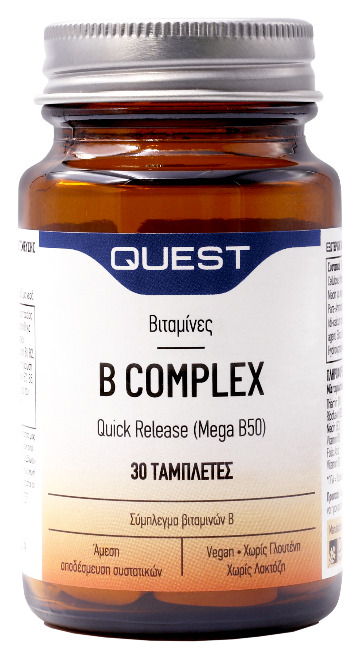 Οι βιταμίνες Β2, Β3, Β6 και Β12 δίνουν ενέργεια και μειώνουν την κόπωση και τη σωματική εξάντληση. Οι βιταμίνες Β1, Β12 και βιοτίνη συμβάλλουν στην καλή λειτουργία του νευρικού συστήματος και στη φυσιολογική ψυχολογική λειτουργία. Το παντοθενικό οξύ, γνωστό και ως βιταμίνη Β5, βοηθά στη φυσιολογική νοητική επίδοση. Οι βιταμίνες Β6, Β12 και το φυλλικό οξύ συμβάλλουν επίσης στο φυσιολογικό μεταβολισμό της ομοκυστεΐνης. Το B Complex quick release είναι το ιδανικό συμπλήρωμα για όσους νιώθουν κουρασμένοι, θέλουν να έχουν περισσότερη ενέργεια, καλύτερη συγκέντρωση και δυνατότερη μνήμη. Επίσης, προτείνεται σε όσους ακολουθούν δίαιτες πλούσιες σε υδατάνθρακες ή έχουν έντονη φυσική δραστηριότητα, επειδή έχουν αυξημένες απαιτήσεις σε βιταμίνες B.
