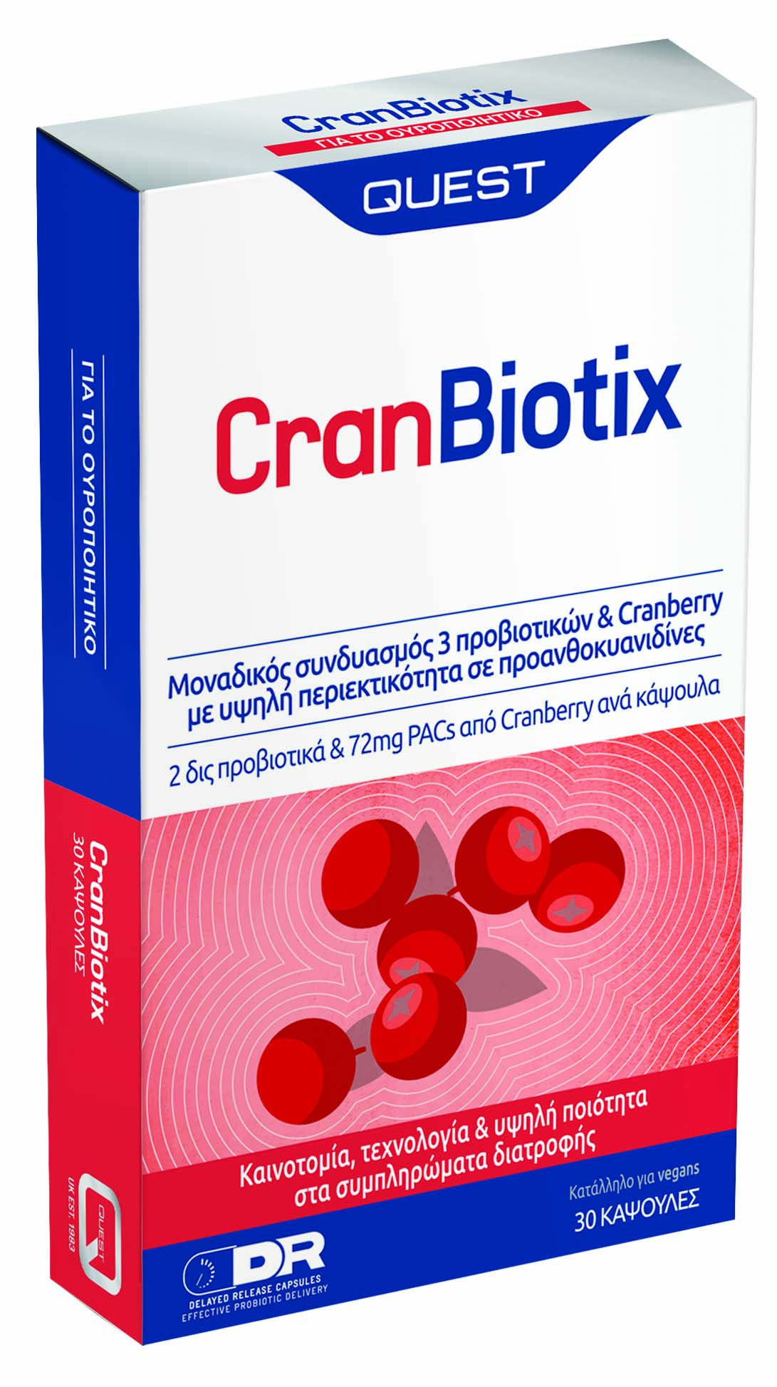 Το CranBiotix της Quest παρέχει προανθοκυανιδίνες από Cranberry και τρία πολύ συγκεκριμένα προβιοτικά στελέχη, τα οποία μπορούν να βοηθήσουν τον οργανισμό να διατηρήσει τα σωστά επίπεδα ωφέλιμων βακτηρίων στο έντερο. Μια καλή εντερική χλωρίδα μπορεί να αποτρέψει την μετάδοση παθογόνων βακτηρίων στον ουροποιητικό σωλήνα.