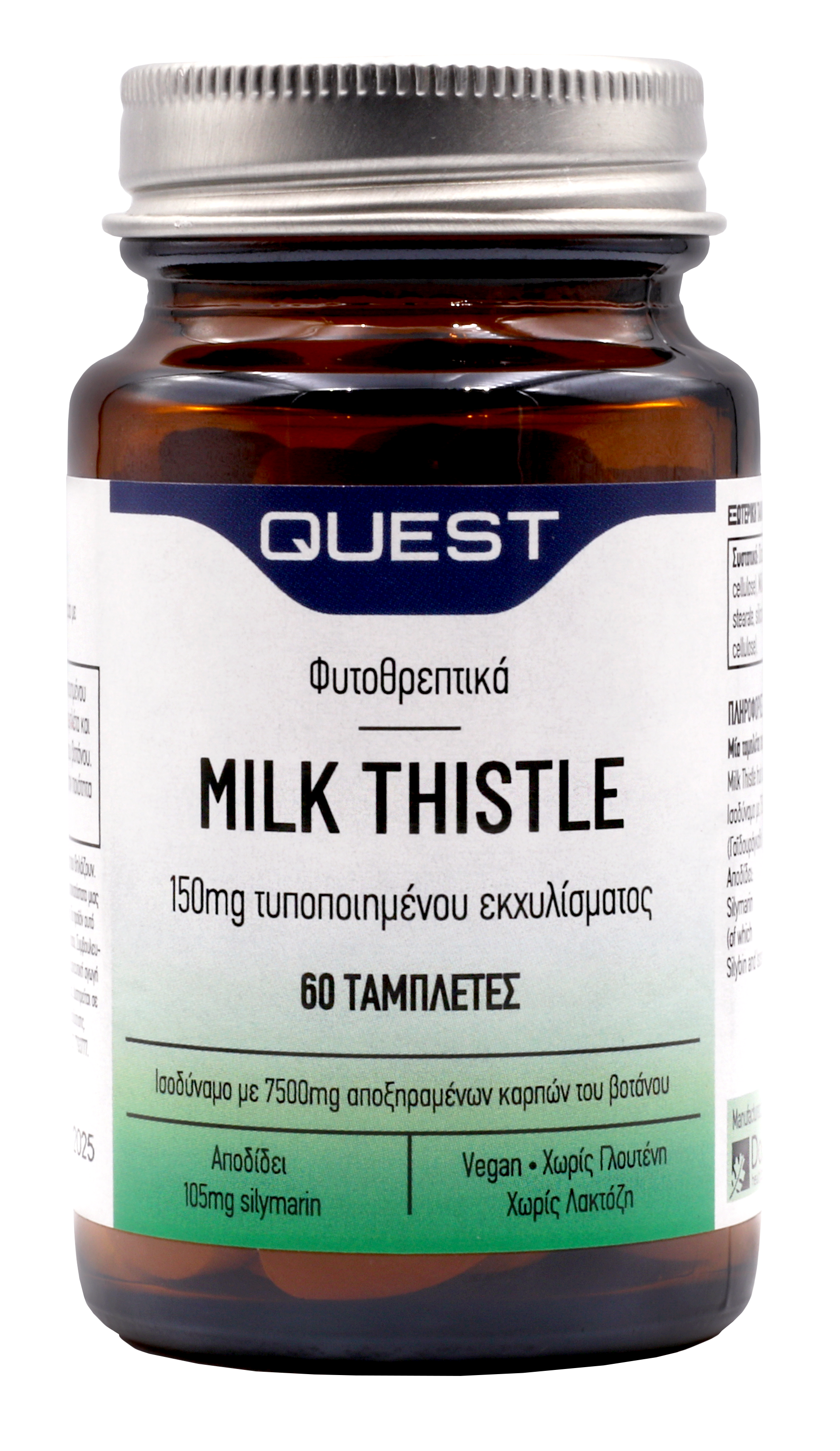 Το Milk Thistle της Quest περιέχει τυποποιημένο εκχύλισμα καρπών Milk Thistle, το οποίο ισοδυναμεί με 7500mg αποξηραμένων καρπών του βοτάνου και αποδίδει 105mg σιλυμαρίνη, που είναι δραστικό συστατικό αυτού του παραδοσιακά χρησιμοποιούμενου βοτάνου.